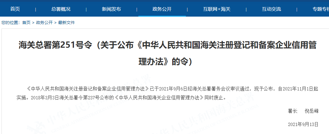 海關(guān)總署于2021年9月13日公布了《中華人民共和國海關(guān)注冊登記和備案企業(yè)信用管理辦法》(海關(guān)總署令第251號,以下簡稱《辦法》),將自2021年11月1日起施行。2018年3月3日海關(guān)總署令第237號公布的《中華人民共和國海關(guān)企業(yè)信用管理辦法》同時(shí)廢止。