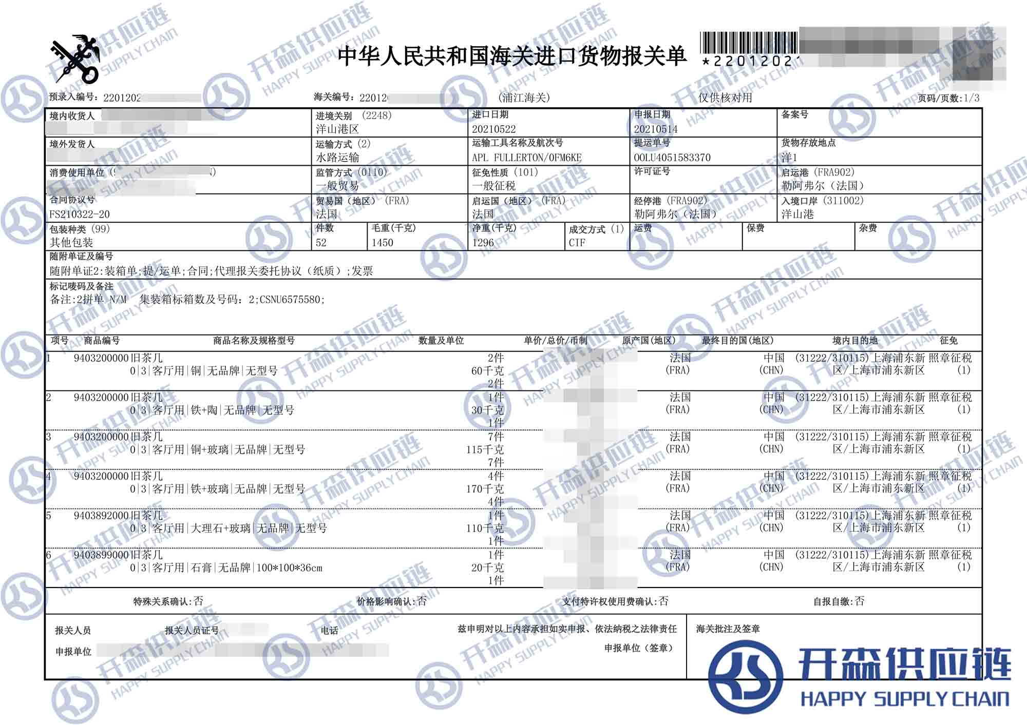【本文結(jié)語】 上述就是法國二手舊茶幾家具進口報關代理案例【經(jīng)典案例】的全部內(nèi)容,希望能對您有所幫助,如有二手家具進口報關上任何疑問及問題可隨時在線聯(lián)系我們或撥打 18002611553,開森供應鏈擁有豐富的二手家具進口報關操作經(jīng)驗及案例,10余年進口經(jīng)驗為您所用,各類進口疑難都能為您一一解答及協(xié)助快速處理解決!