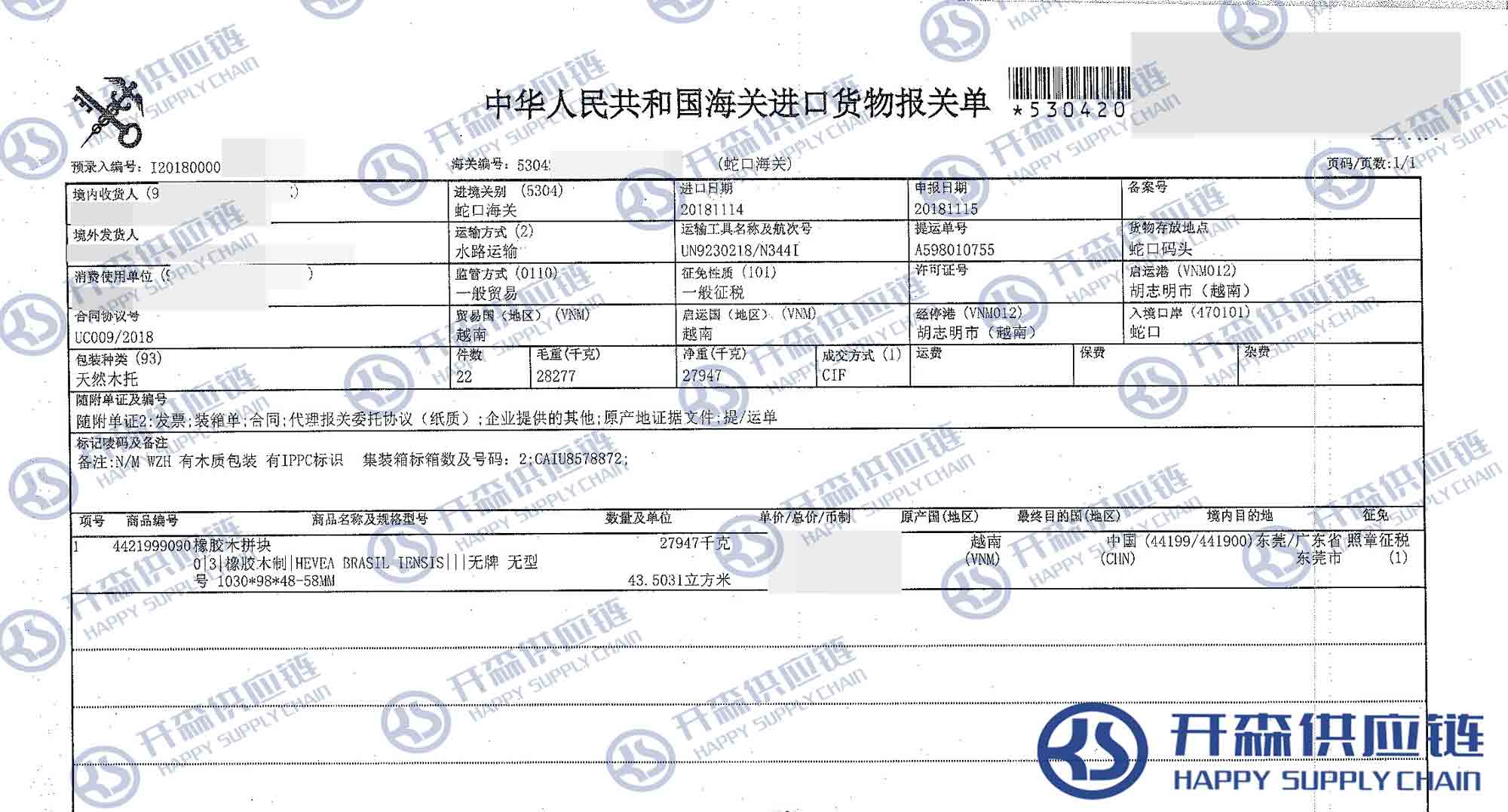 一、越南橡膠木拼塊家具進(jìn)口報關(guān)代理案例詳情
