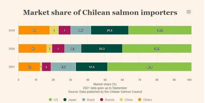 智利產(chǎn)地三文魚也呈現(xiàn)出供應(yīng)減少、價格上浮的情況。據(jù)智利三文魚協(xié)會(ChileanSalmonCouncil)統(tǒng)計數(shù)據(jù)顯示,智利2021年第三季度出口約14萬噸養(yǎng)殖鮭鱒魚類,同比下降16%。從智利2021年1-9月的數(shù)據(jù)來看,美國、巴西的需求已恢復(fù)至疫情前水平,餐飲渠道需求的恢復(fù)和開發(fā)推動了智利三文魚對美國市場的出口量增加,并將價格維持在較高水平。而中國市場則尚未恢復(fù),從2020年中期開始,市場需求一路下滑,雖然2021年第三季度同比增長20%,但仍低于疫情前的水平。