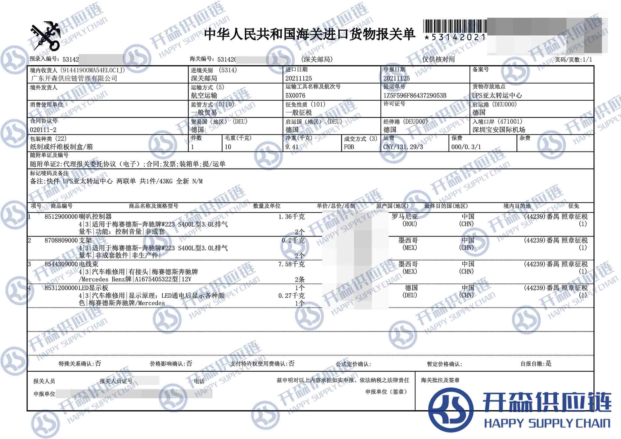 德國奔馳顯示板汽車配件進(jìn)口報(bào)關(guān)代理【進(jìn)口案例】